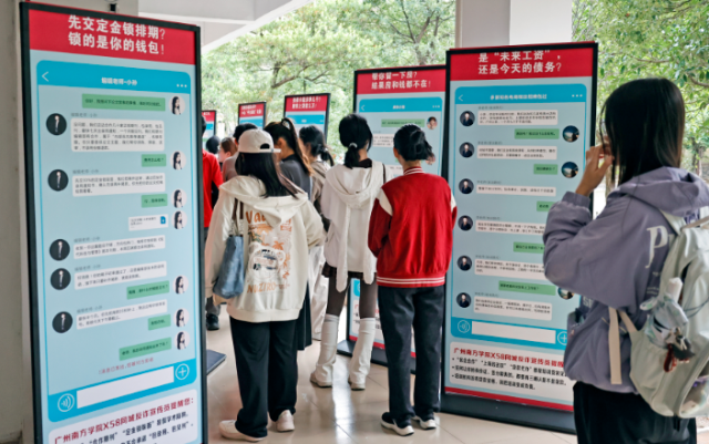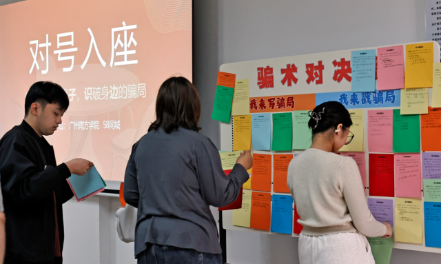 学生们围坐成圈,有人扮演“人事经理”,有人饰演“应聘学生”。这场由广州南方学院联合58同城举办的推理互动游戏,以“看骗局、演骗局、破骗局”为主线,让学生在体验中识别话术陷阱,在共创中形成防骗意识。
